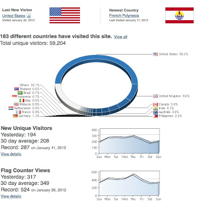 Our blog is monitored by a variety of web user tracking services. They let me know if anyone is reading what I write. The services include FlagCounter, SiteMeter, StatCounter and Google Analytics.
